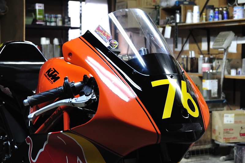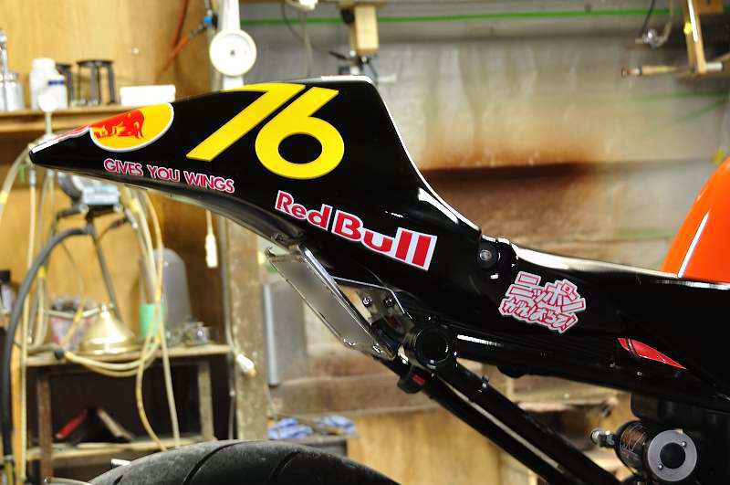真っ黒でシートカウルの形状がハッキリしないのもマズいのかな?と思い、ロゴを少し変形させてシートカウルのラインを強調してみたつもり。 |
