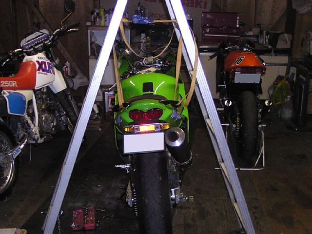 フォークのOH時と同様、脚立を利用して車体を吊り上げまーす。