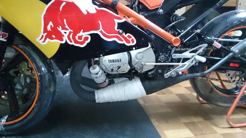 チャンバーとカウルが接触してるので、そのまま走るとカウルが焼けちゃいます。