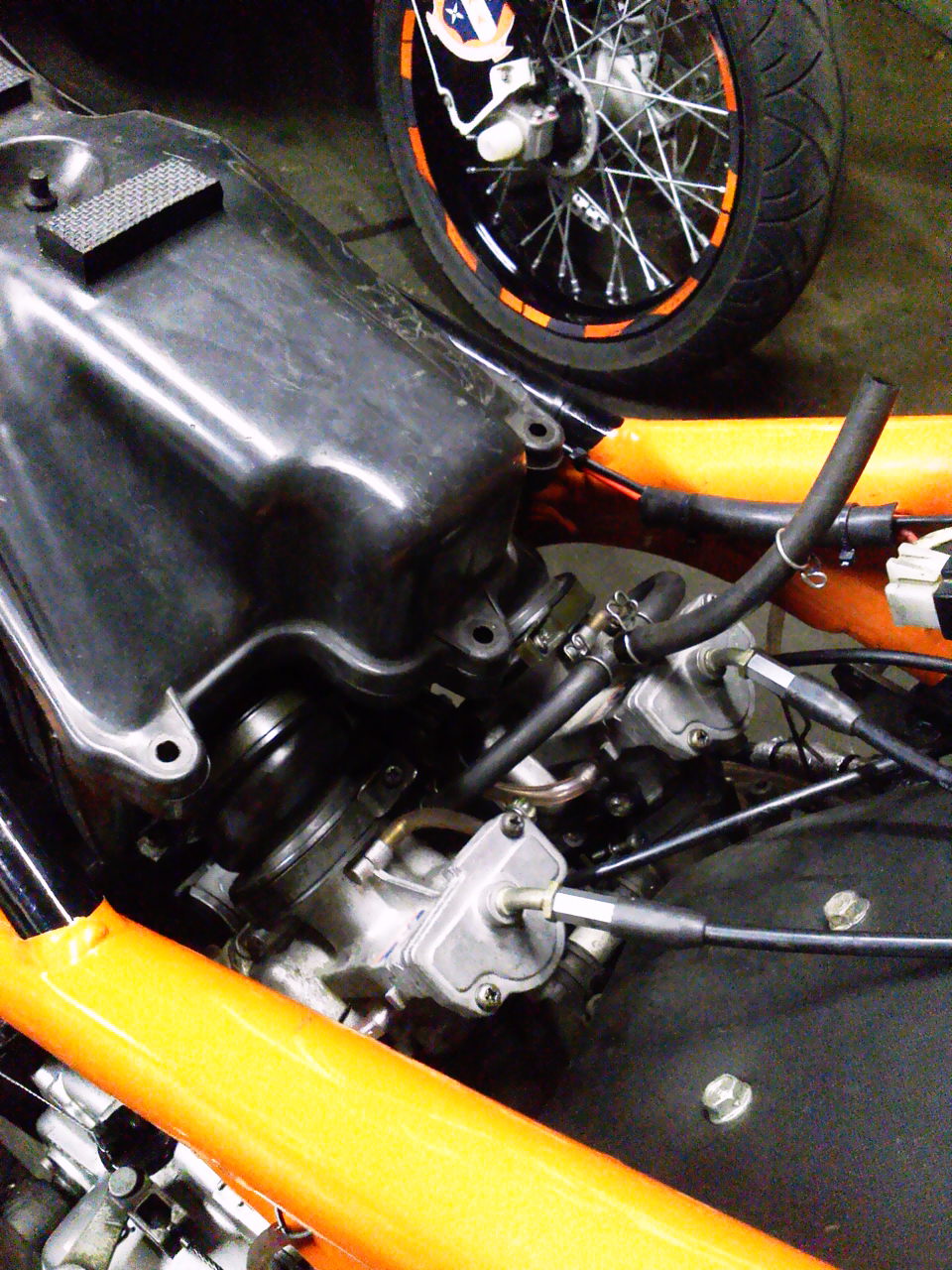 直キャブで乗ってる人の話聞いてると、転倒時に砂が入ったりするっていうので箱はつけておきたいなーって思ったんだけど、すんなり入らないのでキャブごと囲うキャブボックスを作ろうか。