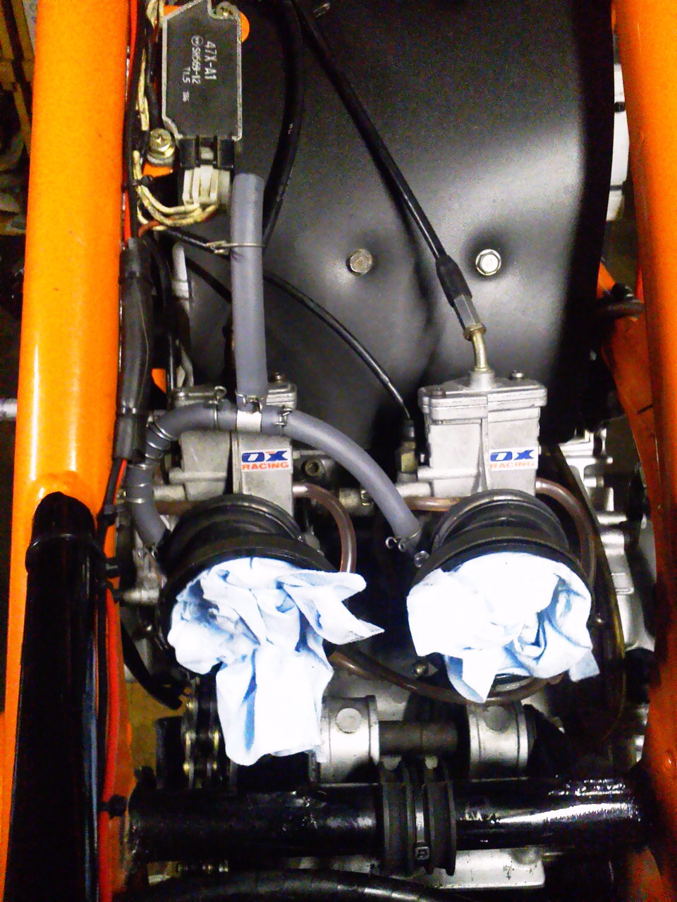 OXキャブはエアクリも使うことができるという話なので、試しに箱つけようとしたらキャブとのジョイントが結構キツイ。