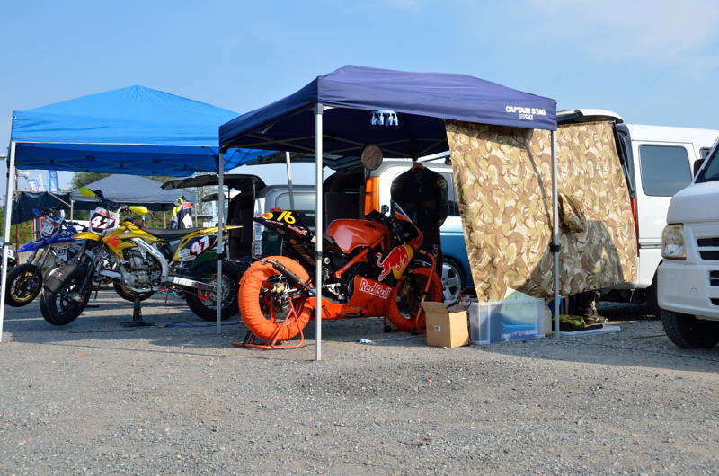 行列の後ろのほうだったので舗装されたパドックスペースはすぐ埋まってしまい、未舗装スペースでテント設営です。